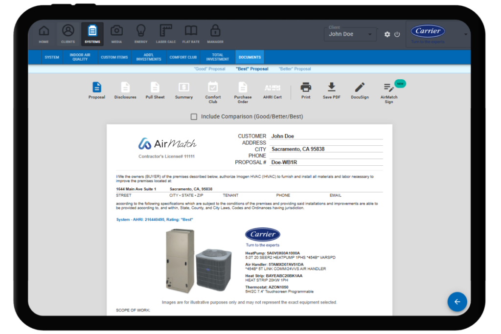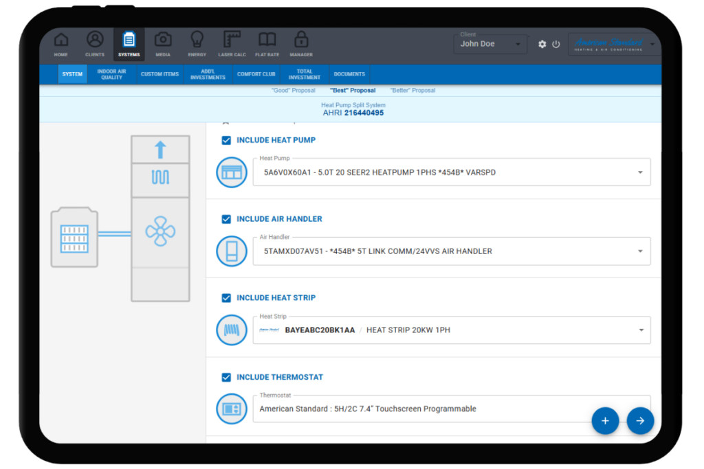 Build perfect HVAC systems with our System Builder. Our innovative sales software integrates AHRI matching, ensuring accurate system configurations. Customize proposals with ease, tailoring them to your customers’ needs. Experience the power of precise system matching.